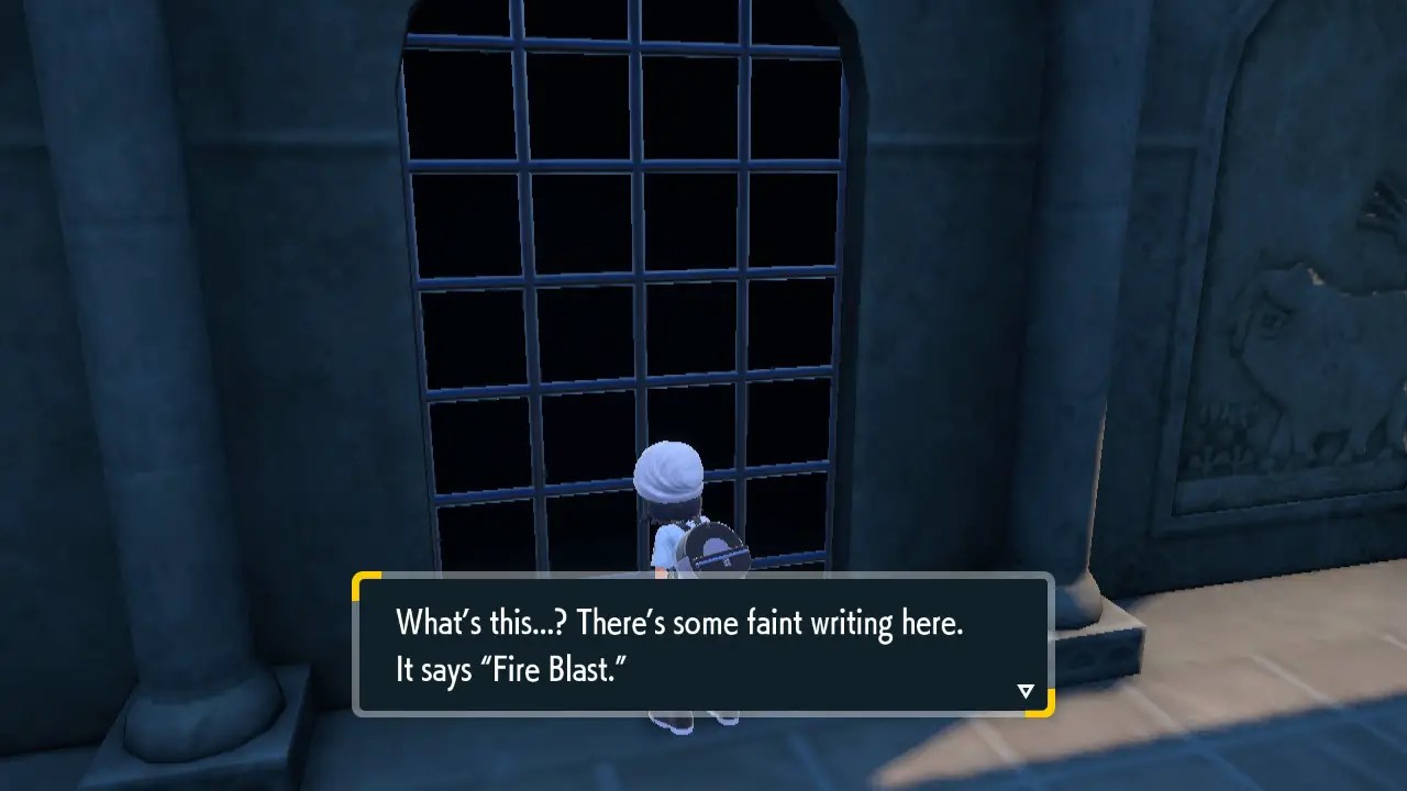 Head down the stairs just behind this trainer and interact with the caged off area, you’ll be given some kind of clue: “Fire Blast”